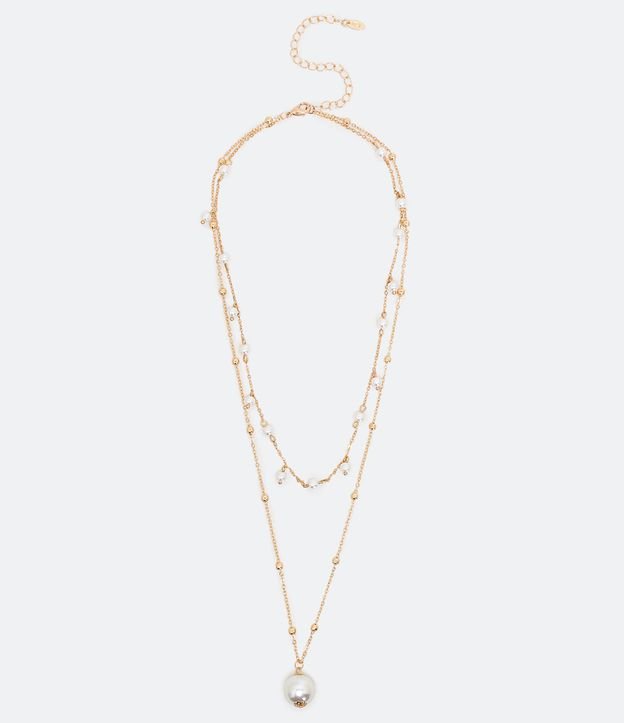 Colar Longo em Camadas com Contas de Metal e Pérola e Pingente Centralizado