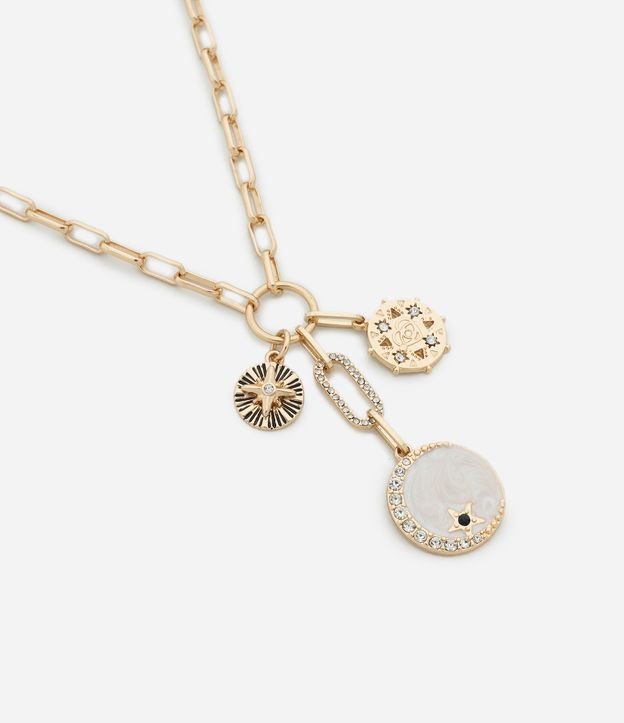 Colar feminino médio confeccionado com metal reciclado mais sustentável. Possui corrente de elos alongado, fecho ajustável, pingentes delicados, incluindo peça em madrepérola, medalhas metálicas texturizadas, criando composição elegante e versátil.