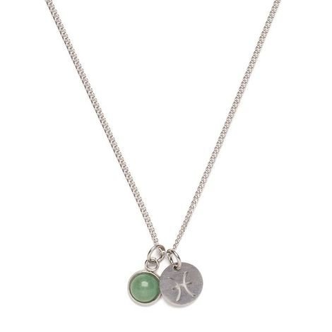 Colar produzido em aço inoxidável na cor prata. Possui corrente de elos entrelaçados de 2mm, pingente de pedra Aventurita verde com 8mm, pingente do signo de peixes com 12mm e fechamento posterior por gancho.