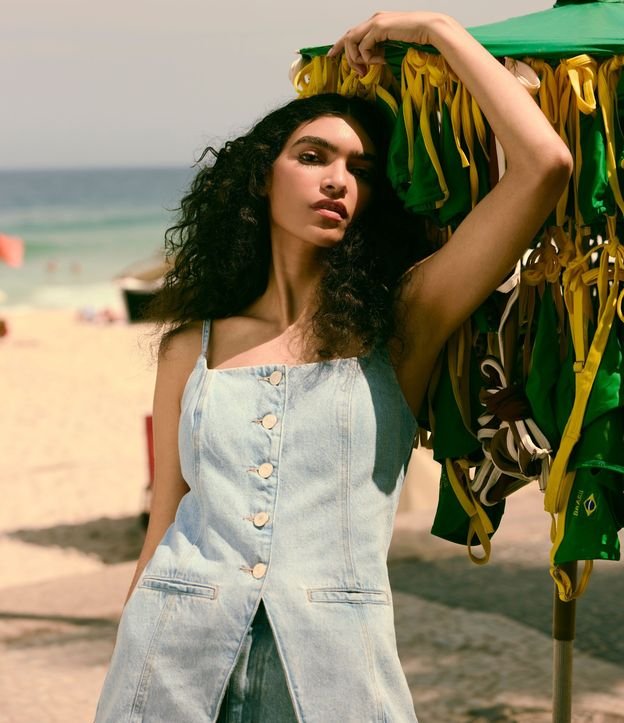 Colete longo de alcinhas finas reguláveis, confeccionado em jeans, com decote reto, botões frontais, pences, bolsos frontais falsos e barra V. Este produto possui algodão certificado BCI em sua composição, sendo ambientalmente mais responsável.