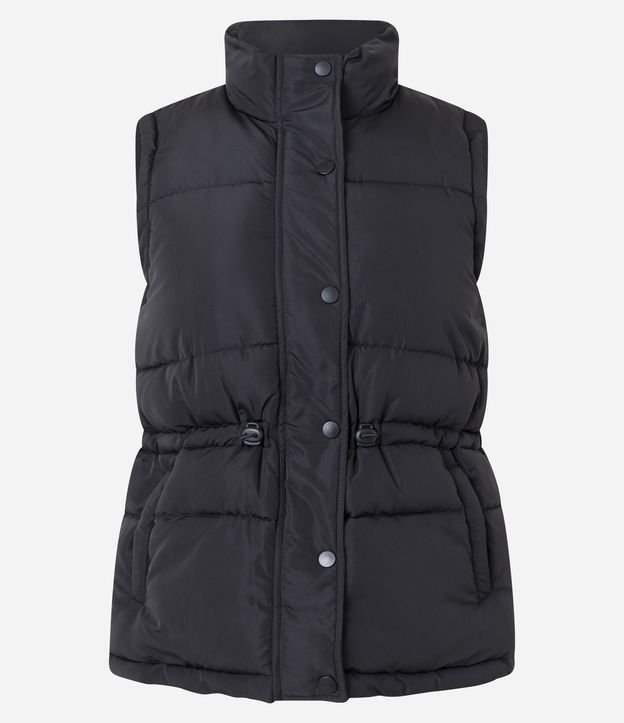 Colete feminino acolchoado com gola alta estruturada, abertura frontal, bolsos laterais e reguladores na cintura que ajustam o caimento.