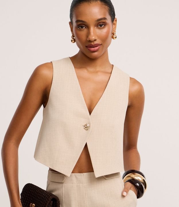 Colete Alfaiatado com Botão Diferenciado e Brilhos Bege