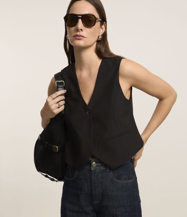 Colete alfaiatado feminino, confeccionado em poliéster e viscose, com abotoamento único e bolsos.