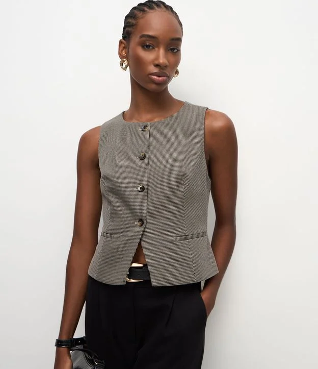 Colete feminino em alfaiataria com padronagem de mini xadrez. Possui decote reto, abotoamento frontal e bolsos embutidos discretos.