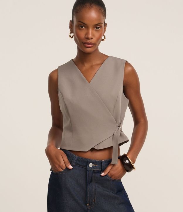 Colete feminino em alfaiataria com decote em v, com frente cruzada e cinto lateral.