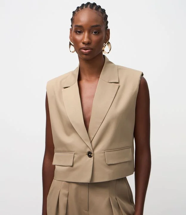 Colete feminino confeccionado em viscose certificada através de boas práticas ambientais. Possui modelo sem mangas, gola de lapela clássica, ombreiras, fechamento frontal por um único botão e dois bolsos com tampas decorativa. Design minimalista e versátil para composições formais ou casuais.