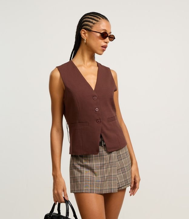Colete alongado, alfaiataria com decote V, abotoamento frontal e bolsos embutidos.