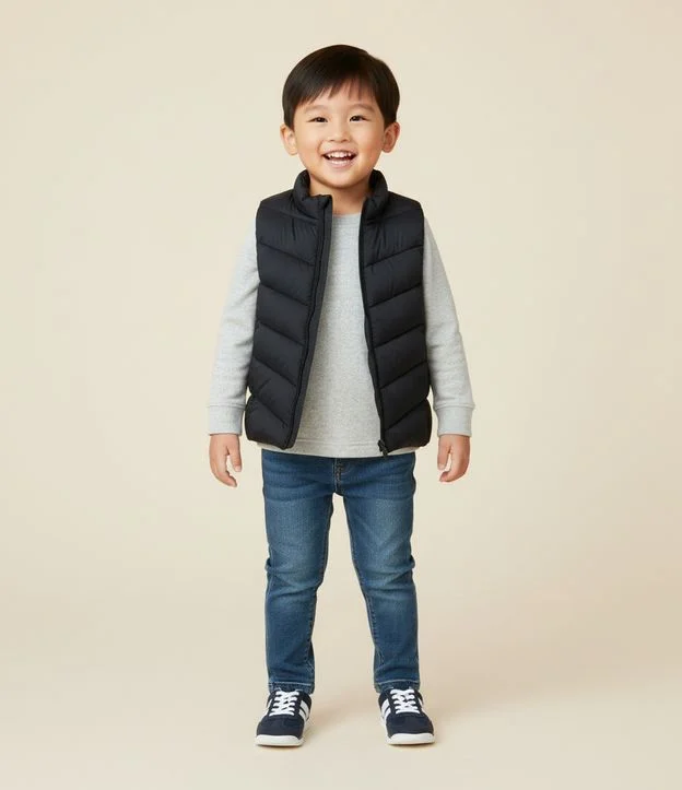 Colete infantil confeccionado em microfibra pesada com enchimento acolchoado, garantindo aquecimento e conforto. Possui gola alta, fechamento por zíper frontal e bolsos laterais funcionais.