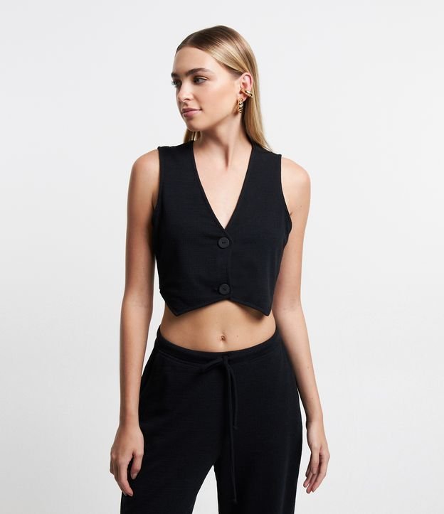 Colete Cropped Texturizado em Alfaiataria com Botões e Barra em V