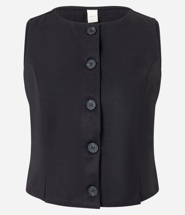Colete feminino curto com corte alfaiatado, gola redonda, abotoamento frontal com detalhe de fendas. Produto confeccionado em viscose certificada com boas práticas ambientais.