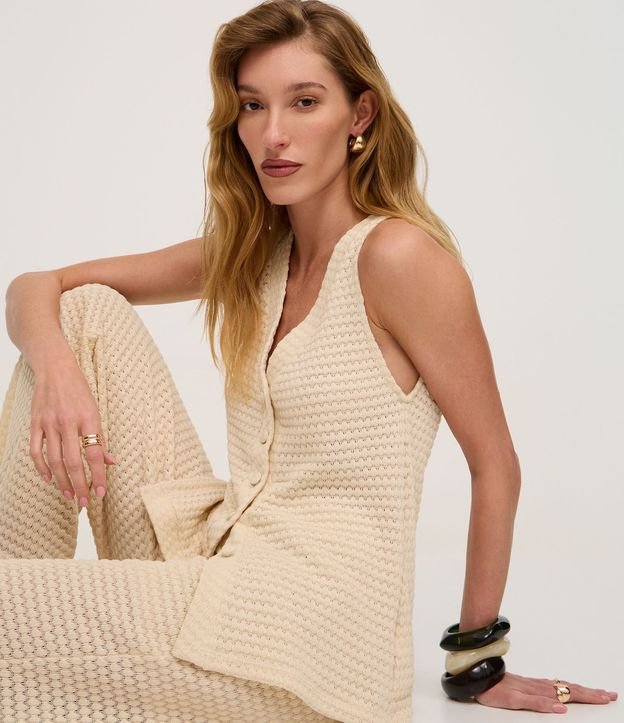 Colete de crochê feminino. Possui um corte reto e levemente alongado, decote em v, alças largas, fechamento frontal por botões revestidos no mesmo material da peça.