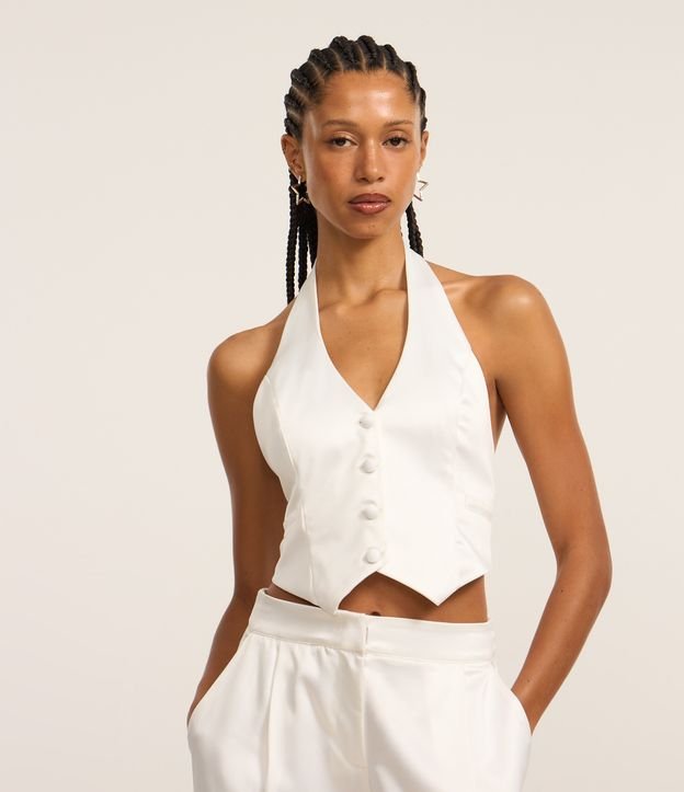 Colete feminina em cetim com frente única, abotoamento frontal e tira afivelada nas costas.