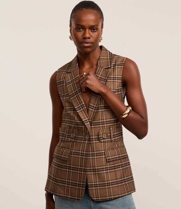 Colete em Crepe Xadrez com Gola Blazer e Cinto Embutido