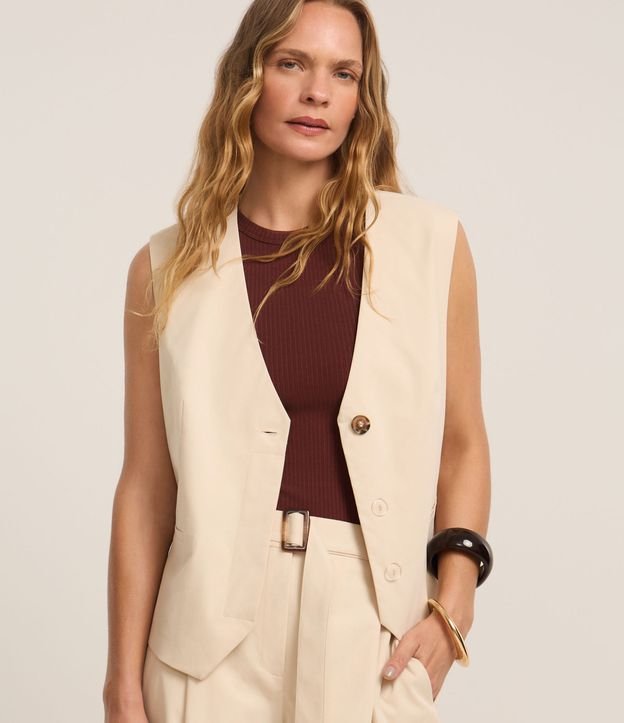 Colete em Efeito Sarja com Botão Único e Bolsos Falsos Bege