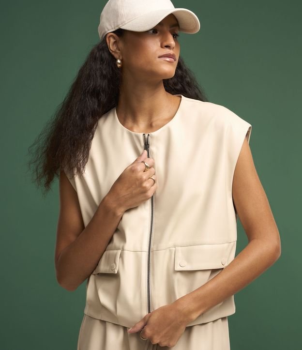 Colete em PU com Bolsos Frontais e Fechamento em Zíper Bege