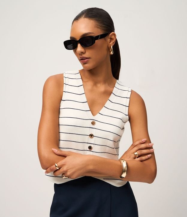 Colete em Tricô com Fechamento por Botões e Estampa Listrada Branco