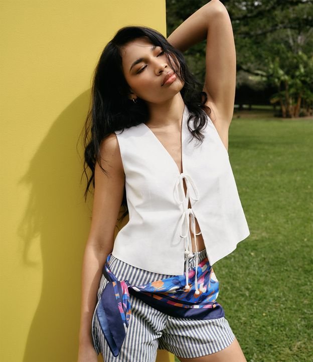Colete feminino, confeccionado em viscolinho, com amarrações frontais e superfície sem estampa.