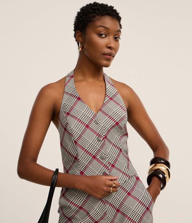 Colete feminino em alfaiataria com frente única, fechamento no pescoço, abotoamento frontal e estampa xadrez.