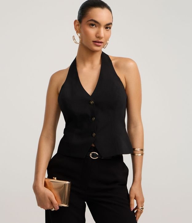 Colete alfaiatado de frente única, confeccionada em tecido plano, com amarração nas costas e abotoamento frontal; Este produto foi fabricado através de processos mais sustentáveis, sendo ambientalmente mais responsável.