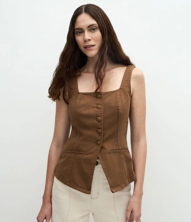 Colete Regular em Sarja com Decote Quadrado Marrom Médio