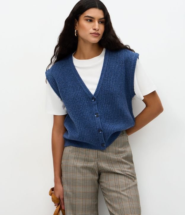 Colete Regular em Tricô com Abotoamento Frontal Azul
