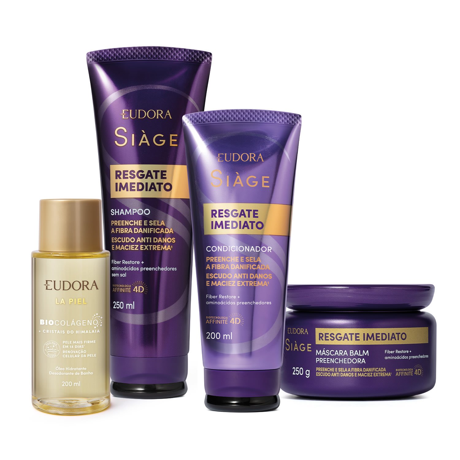 Ideal para a sua rotina de autocuidado, o Combo Cabelos e Banho traz a linha Siàge Resgate Imediato com shampoo e condicionador para a limpeza diária e máscara capilar para o tratamento semanal. Além disso, também traz um óleo de banho La Piel Cristais do Himalaia para cuidar da sua pele em seus momentos de higiene e relaxamento: