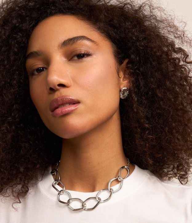 Conjunto Brinco Botão Oval e Colar de Elos com Textura