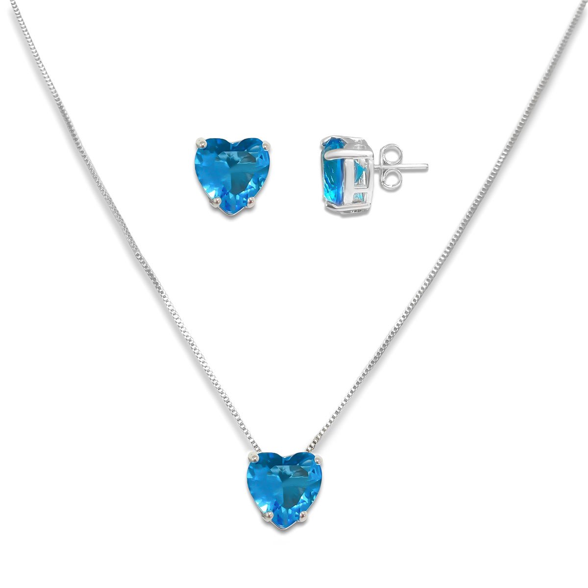 Conjunto Brinco e Colar Coracao Azul Banhado a Prata Prata