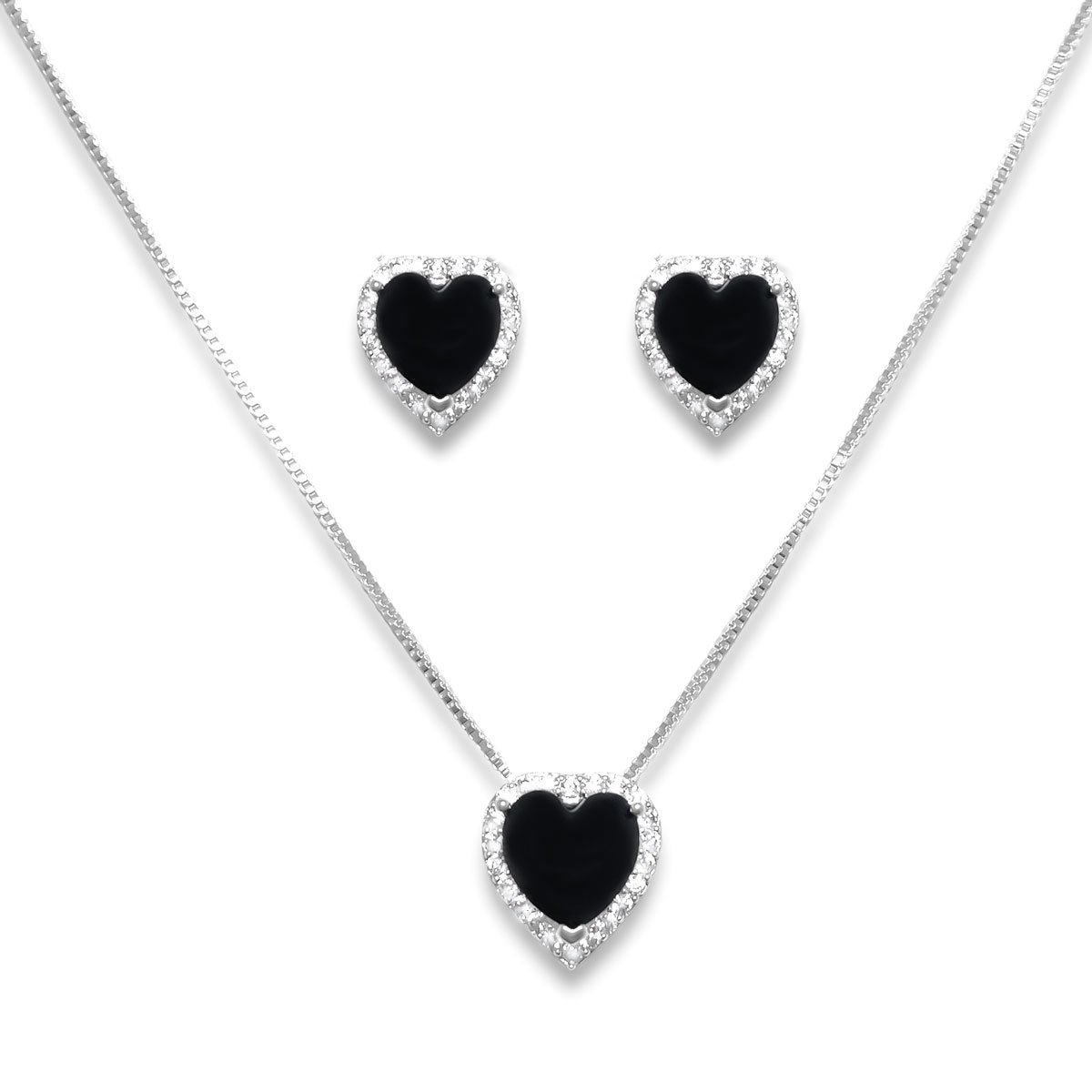 Conjunto Brinco e Colar Coracao Preto e Zirconia Banhado a Prata