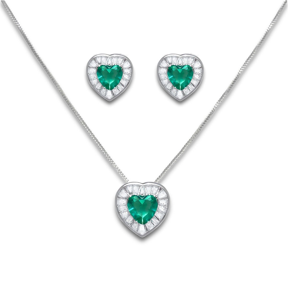 Conjunto Brinco e Colar Coracao Verde Turmalina e Zirconia Baguete Banhado a Prata