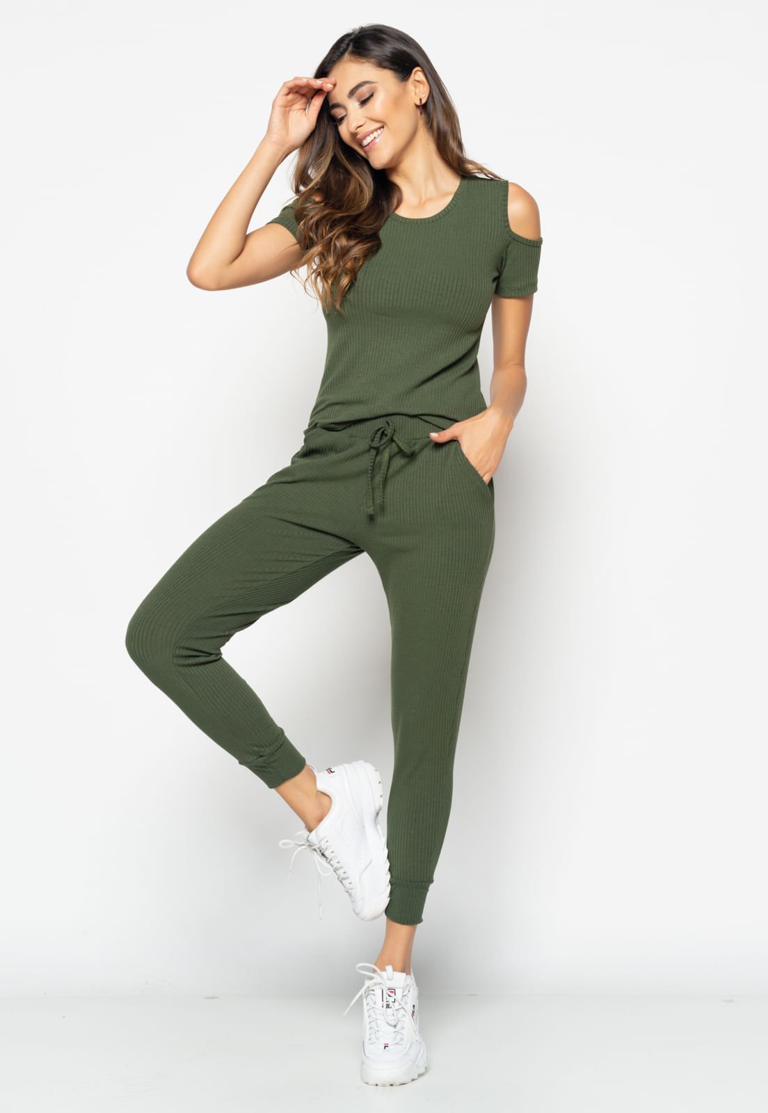 Conjunto Comfy Com Blusa Ombro Vazado e Jogger Canelada Verde Salvatore Fashion