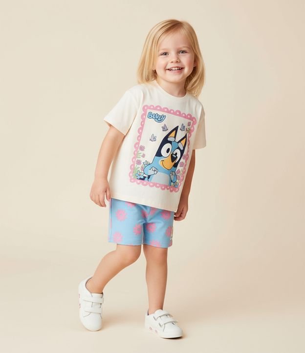 Conjuntinho infantil confeccionado em algodão mias sustentável, com blusa de gola redonda, mangas curtas, estampa Bluey e bermuda ciclista, com cós elástico, estampa de florzinhas.