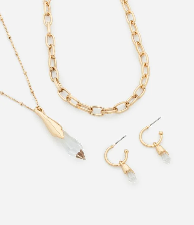 Conjunto de acessórios com colar, brincos e correntinha. O colar possui pingente em cristal e seu cordão tem pequenos detalhes em forma de nó, os brincos são pequenos e possuem argolinhas com pingente de cristal e a correntinha possui o formato de elos pequenos.