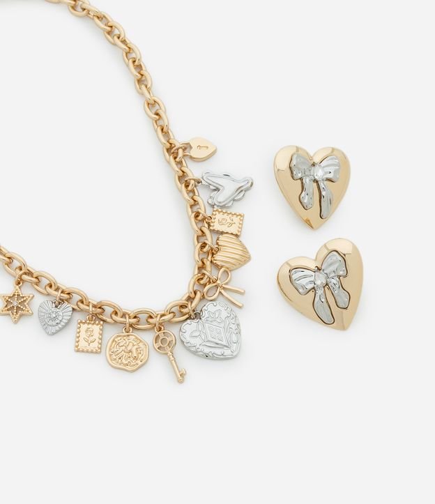 Conjunto de Colar com Pingentes Variados Bicolor e Brinco Coração com Laço Dourado