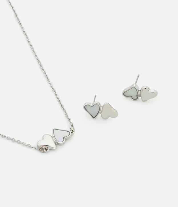 Conjunto de colar curto com pingente de coração duplo em madrepérola acompanhado de par de brincos combinando. Produto confeccionado em metal reciclado.