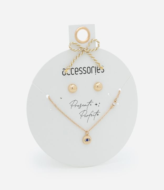 Conjunto de Colar Curto com Pingente de Olho com Strass e Brinco Botão Dourado