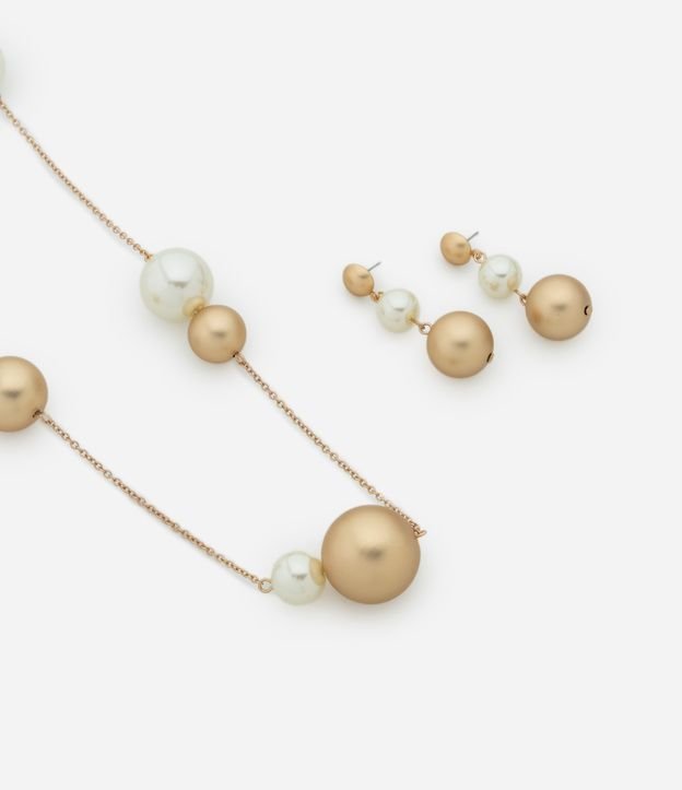 Conjunto de colar e brincos confeccionado em metal reciclado mais sustentável. Possui um colar longo com detalhes perolados e fechamento por lagosta. Os brincos possui fechamento por tarraxa.