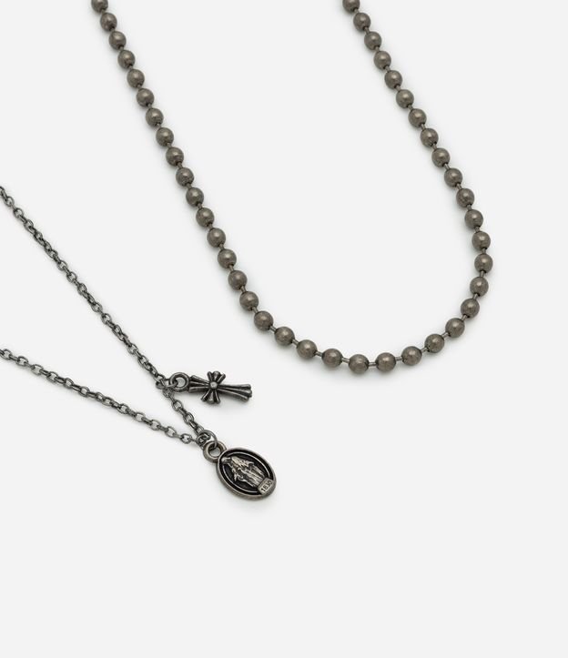 Conjunto de colar confeccionado em metal através de boas práticas ambientais. São 02 colares: corrente fina, pingentes de medalha oval com figura sacra em relevo e medalha cruz pequena, fechamento tipo lagosta; e corrente de bolinhas com fecho canoa.