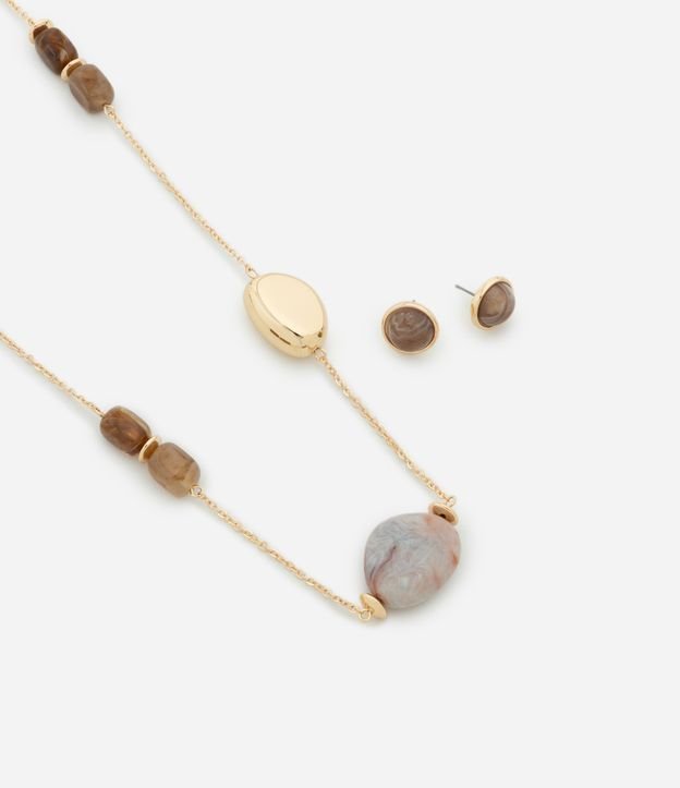 Conjunto de colar e brincos confeccionados em metal mais sustentável. O kit conta com duas peças: um maxi colar com design assimétrico e artístico, que alterna pedras em diferentes formatos, cores e texturas, e um par de brincos arredondados inspirados em pedras naturais, criando um conjunto harmonioso e moderno.