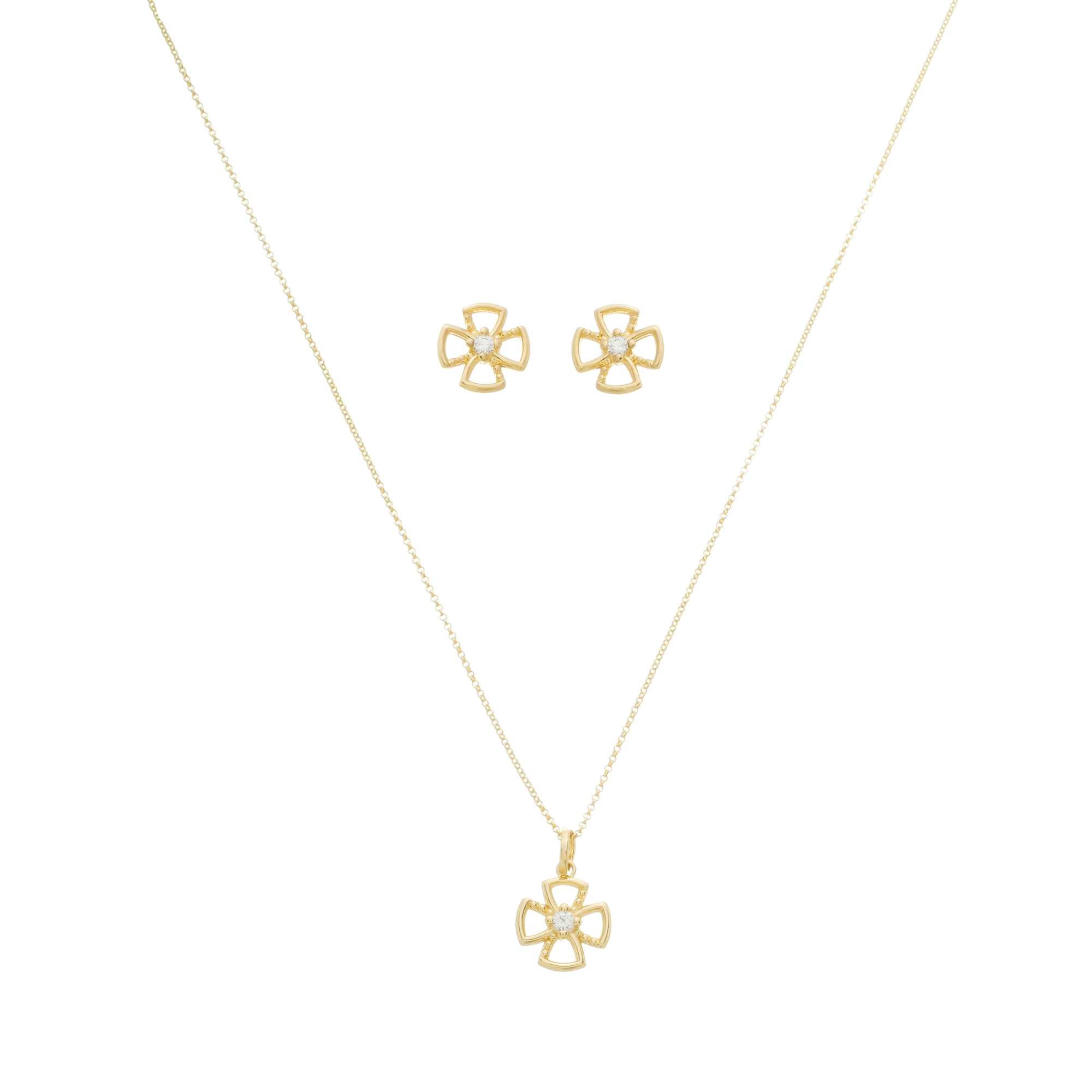 Conjunto Folheado a Ouro 18k Trevo de 4 Folhas e Zircônia Dourado