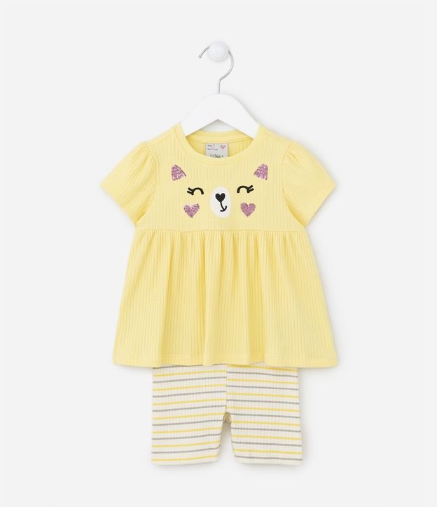 Conjunto Infantil Canelado com Estampa Cara de Bichinho e Listras - Tam 1 a 5 Anos