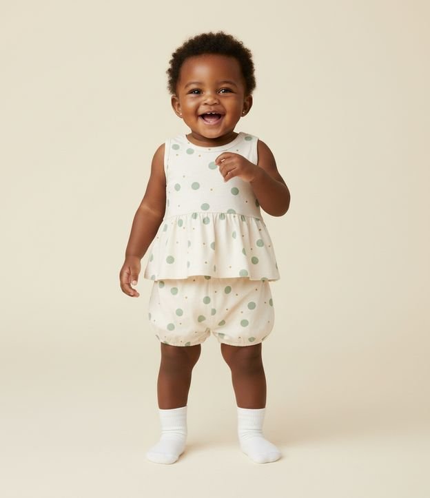 Conjunto Infantil com Babados e Estampa Poá – Tam 0 a 18 Meses Bege Claro