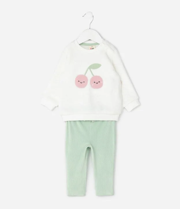 Conjunto Infantil com Bordado de Cerejas e Calça Canelada – Tam 0 a 18 Meses Verde/Branco