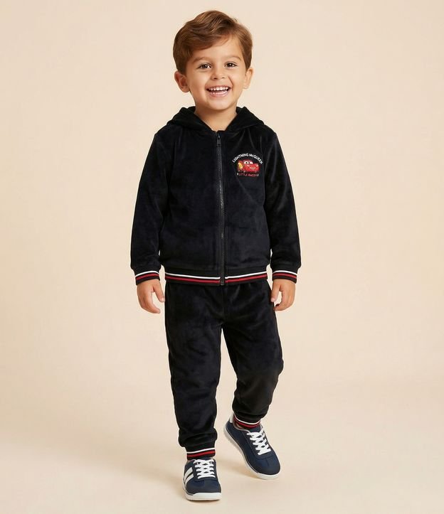 Conjunto infantil confeccionado em plush macio, oferecendo toque aveludado e conforto térmico. O casaco possui capuz, zíper frontal e bordado do Relâmpago McQueen, do filme Cars da Disney Pixar. A calça jogger tem cós elástico e punhos em jacquard listrado.