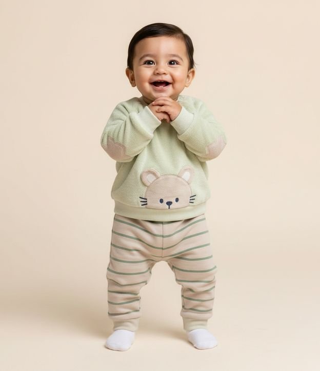 • Conjunto Infantil com Casaco Ratinho e Calça Listrada – Tam 0 a 18 Meses Verde/Bege 1