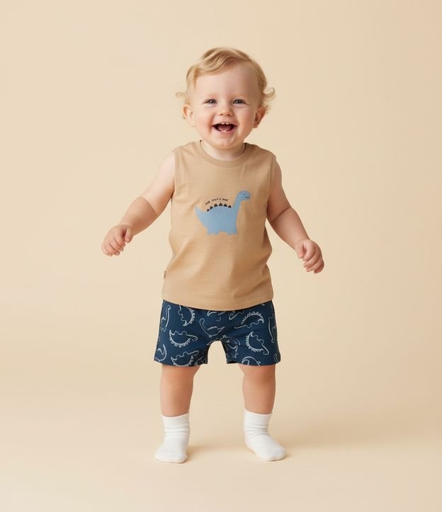 Conjunto Infantil com Estampa de Dino - Tam 3 a 18 Meses Bege/Azul