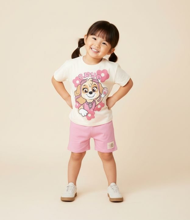 Conjunto infantil confeccionado em algodão BCI e composto por duas peças: camiseta manga curta com estampa da personagem Skye e short ciclista com cintura elástica.