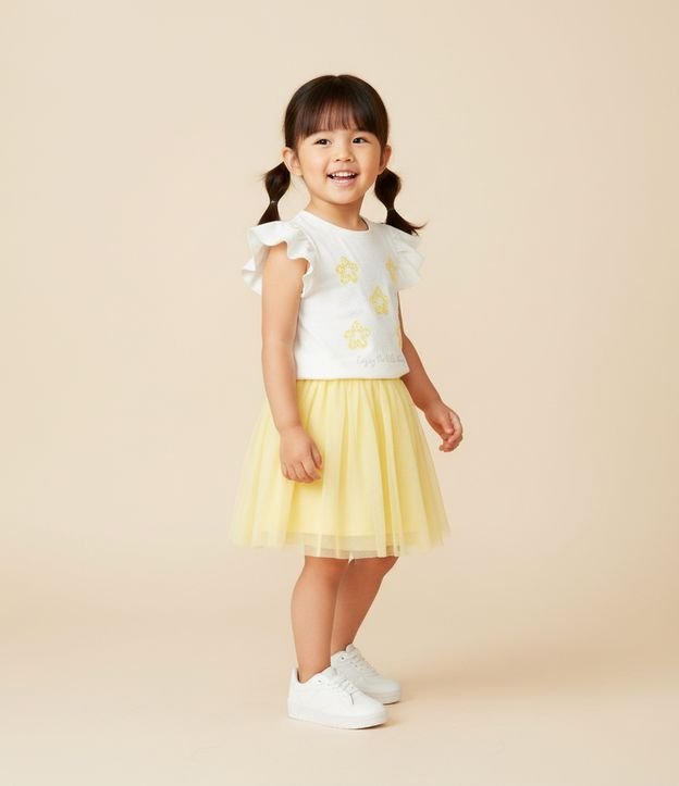 Conjunto Infantil com Flores de Paetês - Tam 1 a 6 Anos Branco/Amarelo