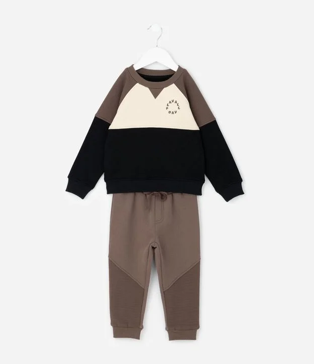 Conjunto infantil confeccionado em moletom com felpa de algodão certificado BCI. O casaco tem gola redonda, mangas longas, recortes contrastantes com detalhe em ottoman e lettering no peito. A calça jogger possui cós elástico com cordão e punhos canelados.