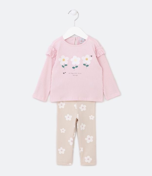 Conjunto Infantil com Textura de Listrinhas e Estampa de Florzinhas - Tam 0 a 18 meses